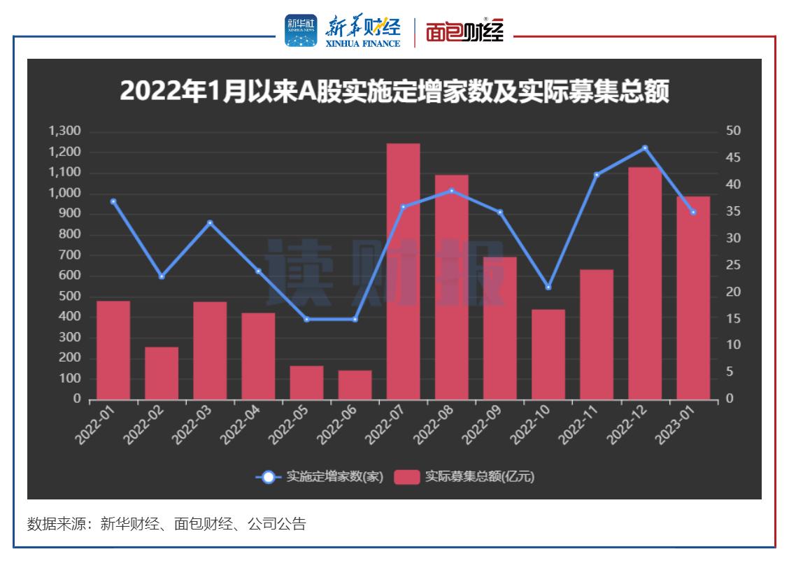 与去年12月相比,2023年1月A股上市公司定增实施家数环比下降25.53%,实际募集总额环比下降12.56%。