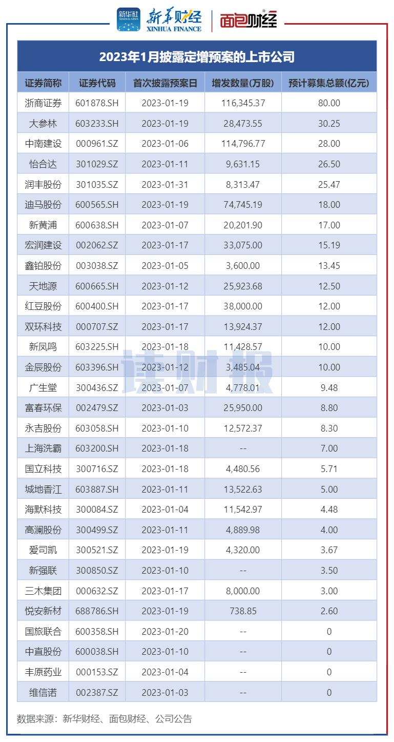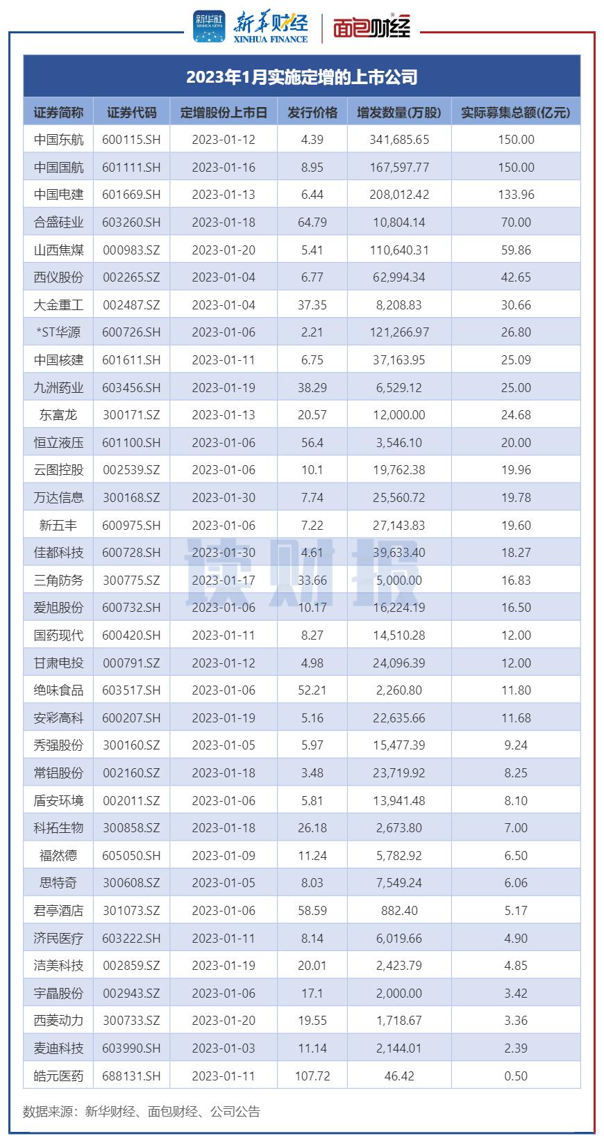 2023年1月实施定增的上市公司中,中国东航和中国国航的实际募资总额并列第一。