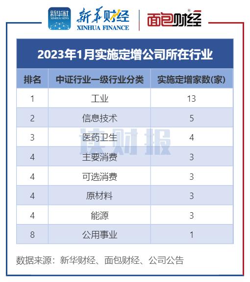 从行业分布来看,以中证行业统计,2023年1月,工业行业有13家上市公司实施定增,排在各行业之首;其次是信息技术行业,有5家上市公司实施定增;医药卫生行业有4家上市公司实施定增,排名第三。
