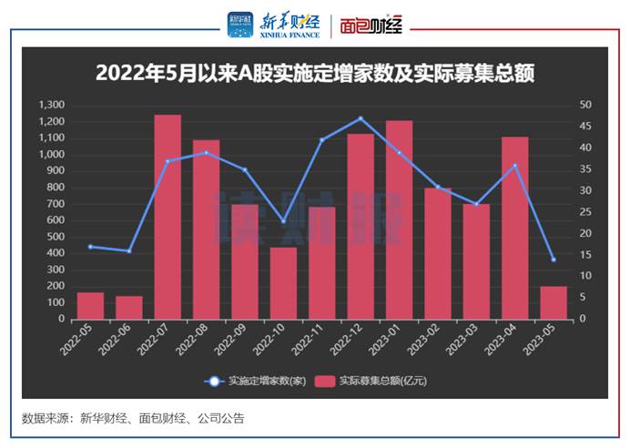 新华财经北京6月7日电 统计显示,2023年5月,A股上市公司共计14家实施定增,实际募资总额约200.65亿元,定增实施家数及实际募集资金环比均明显下降,但实际募集资金同比有所上升。