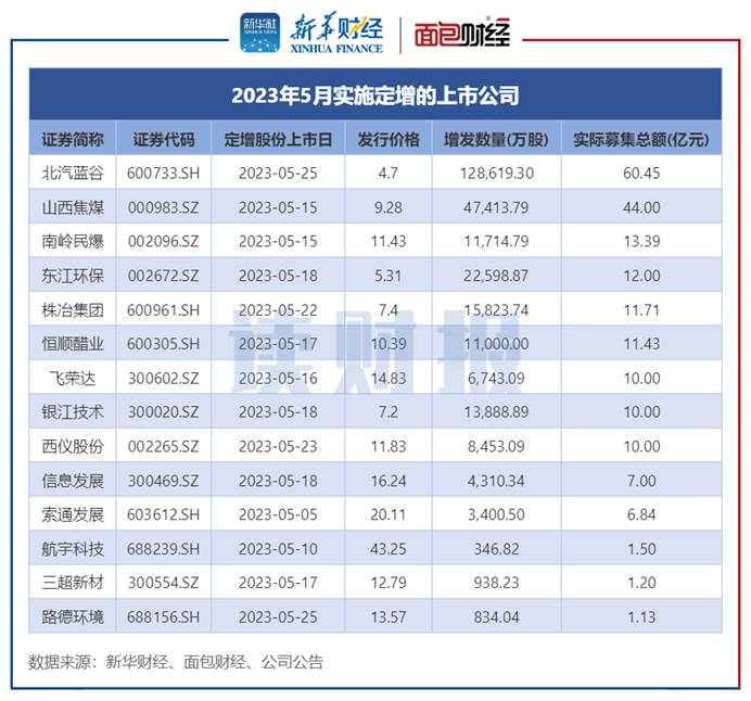 2023年5月实施定增的上市公司中,北汽蓝谷和山西焦煤实际募集总额均超40亿元。