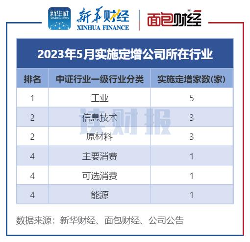 从行业分布来看,以中证行业统计,2023年5月,工业行业5家上市公司实施定增,位居各行业之首;信息技术行业和原材料行业并列第二,均有3起定增实施。