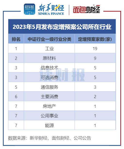 从行业分布来看,以中证行业统计,2023年5月,工业行业有19家上市公司发布定增预案,预计募集资金总额超250亿元,数量排在各行业之首;原材料行业排在第二位,有9家发布定增预案;信息技术行业和可选消费行业并列第三,均有5家发布定增预案。