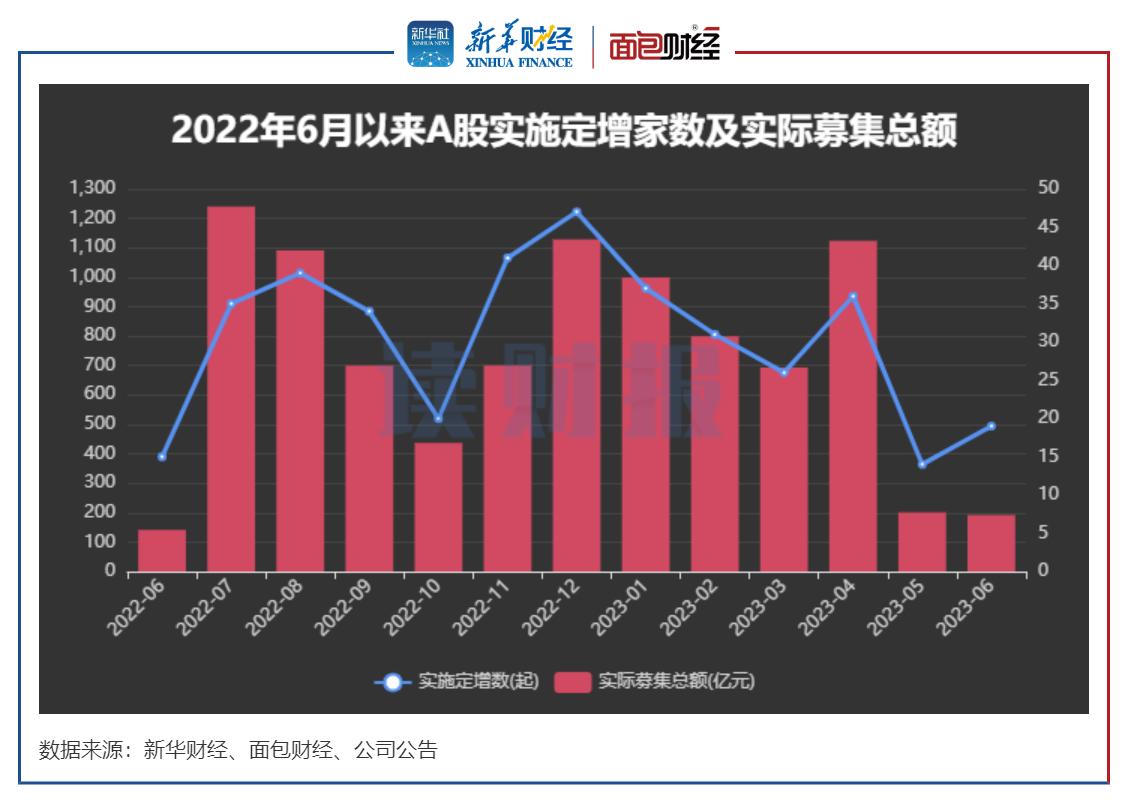 图1:2022年6月以来A股实施定增数量及实际募集总额
