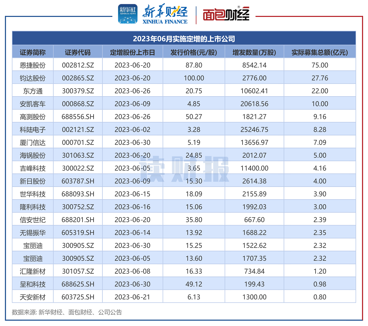 2023年6月实施定增的上市公司中,恩捷股份的实际募资总额排在首位。恩捷股份向21名投资者发行8542.14万股,共募集资金75亿元,发行价格为87.8元/股。UBS AG获配股数最多,达到1240万股,本次定增后UBS AG成为恩捷股份前十大股东。恩捷股份计划将募得资金用于锂电池相关项目及补充流动资金。