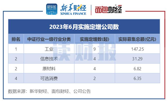 从行业分布来看,以中证行业统计,2023年6月,工业行业实施9起定增,排在各行业之首;其次是信息技术行业、原材料行业,均有4起定增实施,分别募资约31.29亿元、6.82亿元。