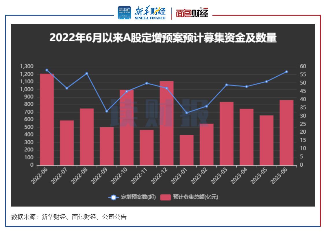 以首次披露预案公告日统计,2023年6月A股上市公司披露的定增预案(同一定增预案下的募资及配套募资合并统计,下同)共计57起,预计募资规模合计约860.67亿元,同比降幅超28%。