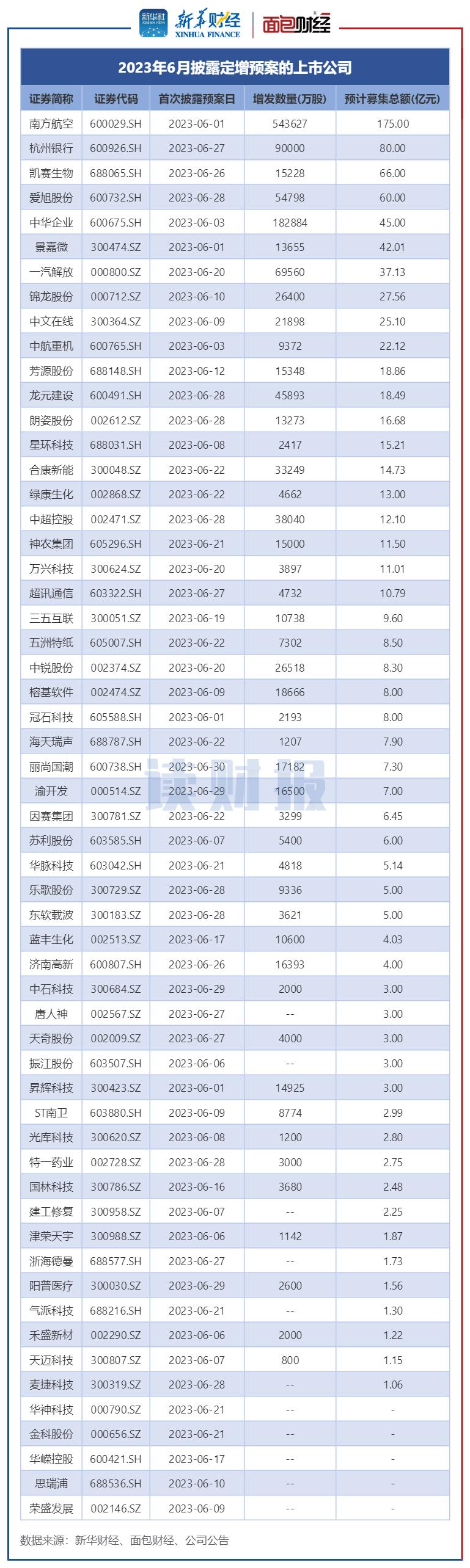 按照首日披露预案日口径统计,2023年6月A股上市公司定增预案发布数量共计57起,拟募资规模约860.67亿元,同比下降超28%。其中,南方航空、杭州银行等企业预计募资规模相对靠前。