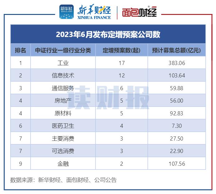 从行业分布来看,以中证行业统计,2023年6月,工业行业发布17起定增预案,合计总额超383亿元,数量和金额均排在各行业之首;信息技术行业排在第二位,有12起定增预案;通信服务行业有6家发布定增预案,位列第三。