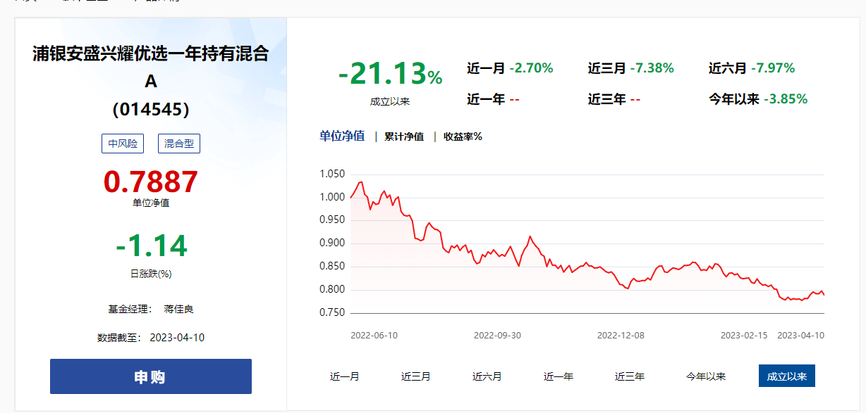 浦银安盛兴耀优选一年持有混合A的最新单位净值为0.7887元,运作约0.8年累计浮亏21.13%,跑输基准超20个百分点。该基金今年以来净值下跌3.85%,跑输基准逾8个百分点,同类排名3184/3543。