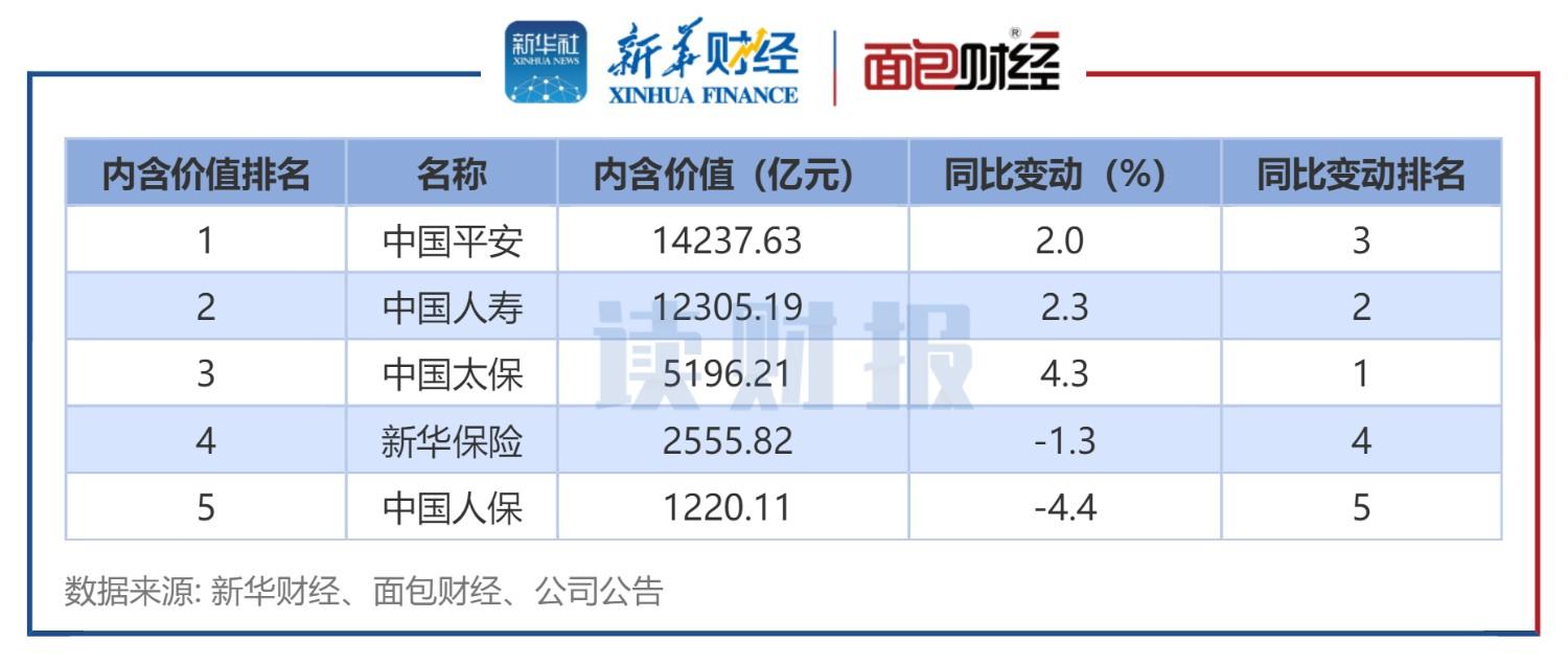 从内含价值规模来看,5家上市险企中,中国平安和中国人寿的内含价值位列前二,分别为14237.63亿元和12305.19亿元;中国人保的内含价值最低,仅1220.11亿元。
