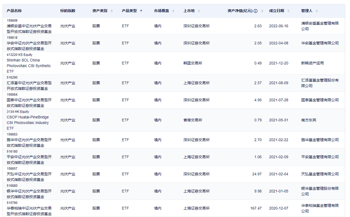 其中,在沪、深交易所流通的ETF基金共有9只。成立时间最早的是华泰柏瑞基金光伏ETF,基金净值超过160亿元,占中证光伏产业指数ETF基金总规模的七成以上。天弘基金、银华基金旗下的ETF基金净值紧随其后,超过9亿元,其他产品规模相对较少。