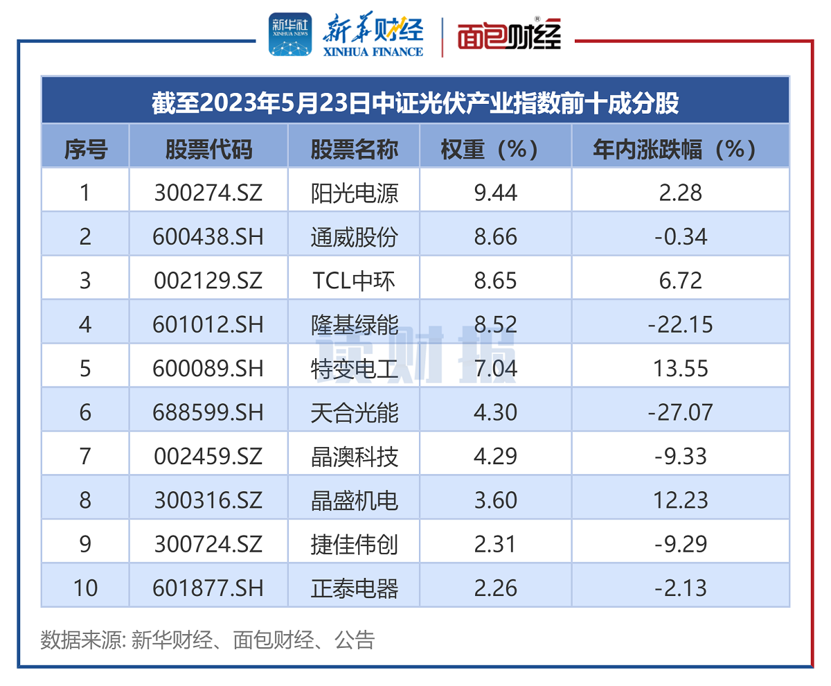 截至2023年5月23日,中证光伏产业指数年内下跌10%。前十大成分股中,天合光能、隆基绿能的股价表现较弱,股价下跌超两成。