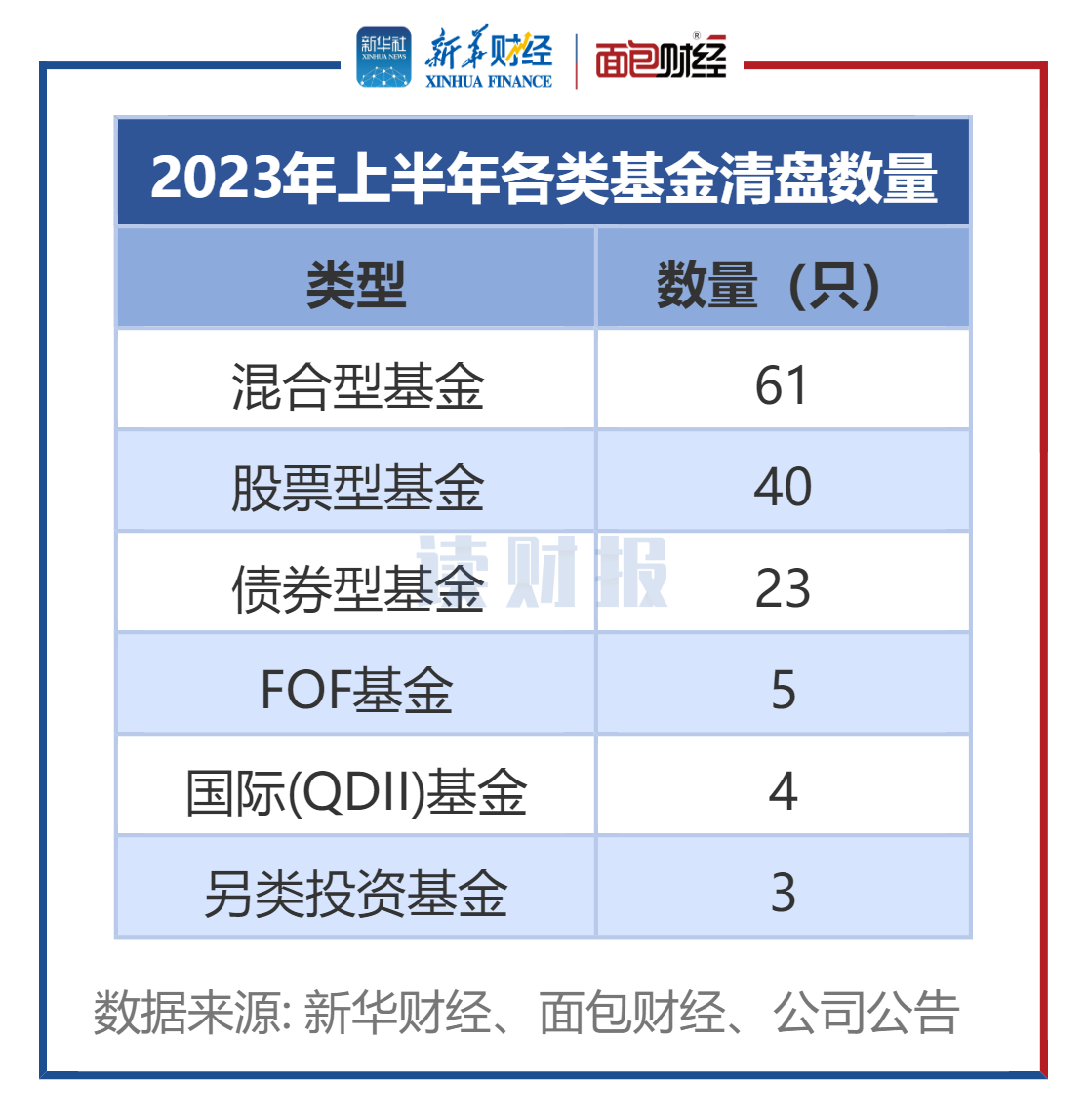 新华财经北京7月10日电(杜康 郭嘉) 按照基金到期日统计,2023年上半年共有136只公募基金发生清盘,以混合型基金和股票型基金为主。海富通基金、招商基金、申万菱信基金等机构的产品清盘数量相对较多。