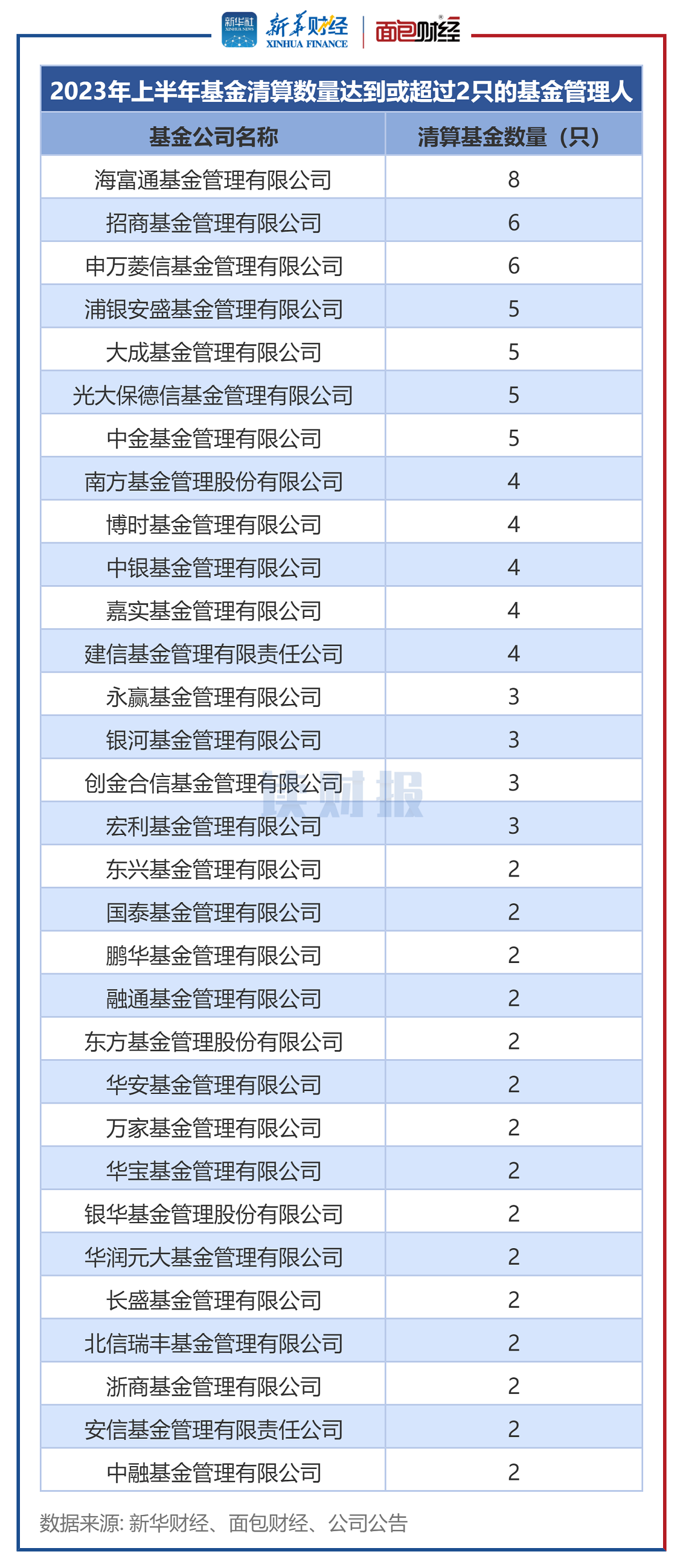 招商基金、申万菱信基金2023年前6月均有6只产品清算,数量仅次于海富通基金。