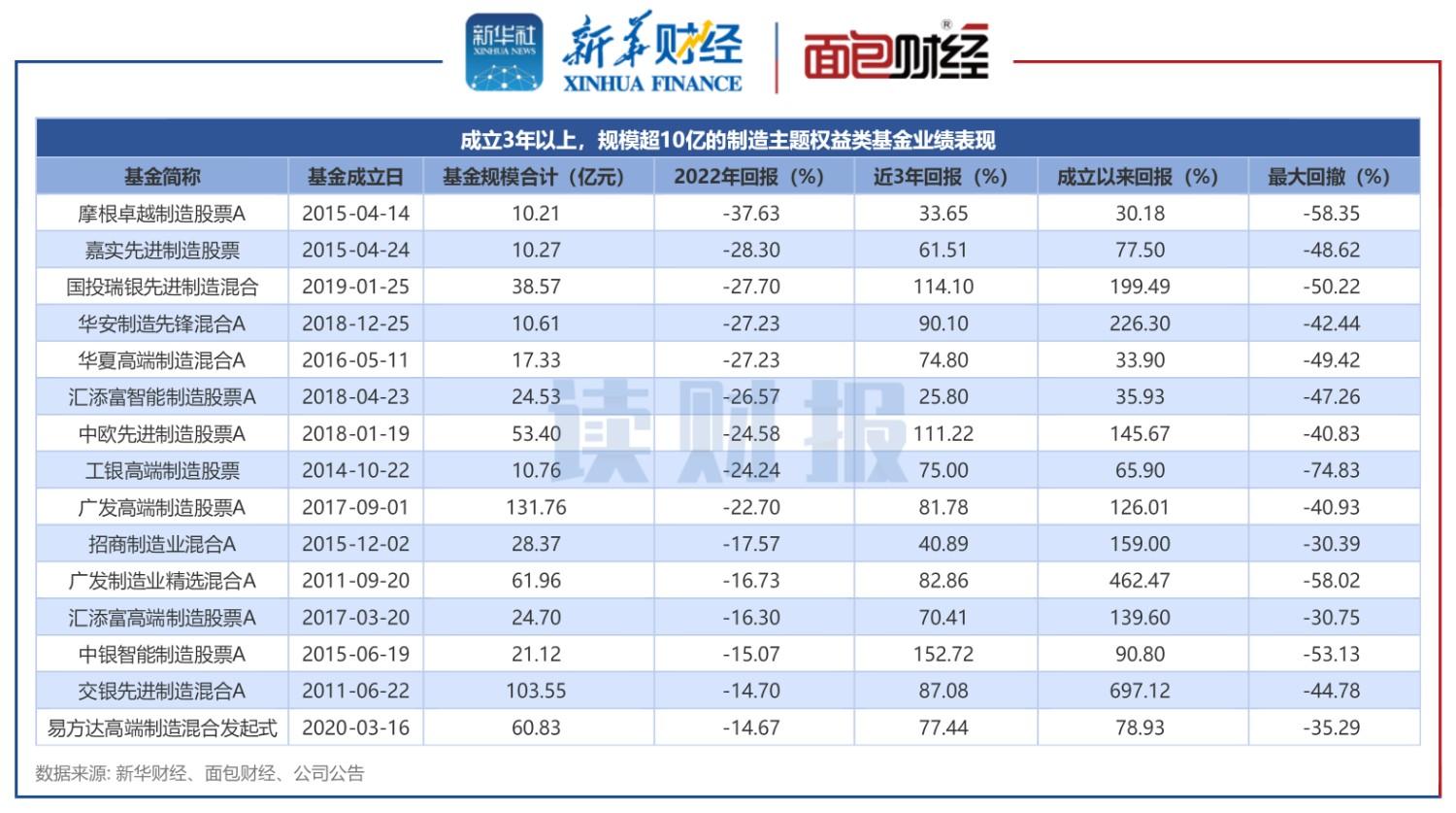 据不完全统计,全市场公募基金名称全称中包含“制造”这一关键词且2022年末规模超过10亿元、成立时间超过3年的主动权益型基金(包括偏股混合型、普通股票型、灵活配置型基金)共有15只(初始基金口径,下同)。
