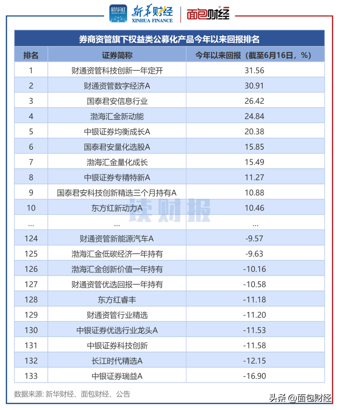今年以来(截至2023年6月16日),券商资管旗下的133只公募化产品中(包括偏股混合型基金、普通股票型基金、灵活配置型基金和平衡混合型基金),有73只基金取得了正收益,另60只基金今年以来收益率为负。在取得正收益的基金中,有5只产品今年以来回报超20%。