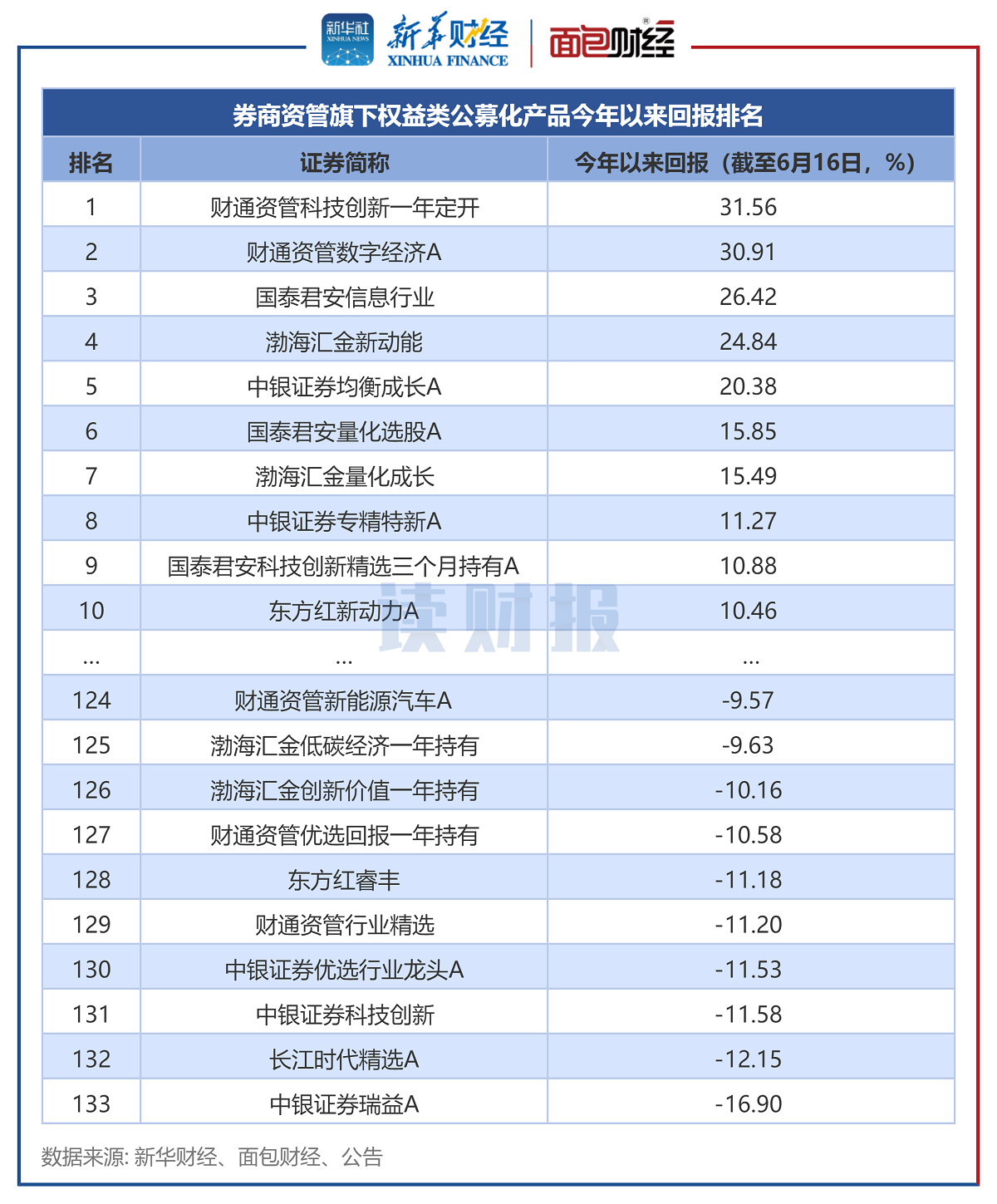 今年以来(截至2023年6月16日),券商资管旗下的133只公募化产品中(包括偏股混合型基金、普通股票型基金、灵活配置型基金和平衡混合型基金),有73只基金取得了正收益,另60只基金今年以来收益率为负。在取得正收益的基金中,有5只产品今年以来回报超20%。