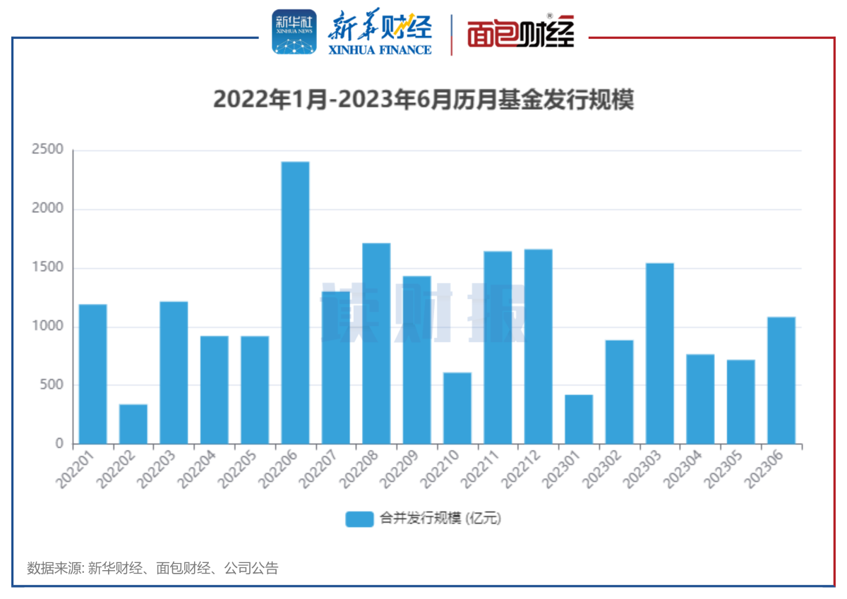 月度发行规模方面,仅3月公募基金发行规模超过千亿元,此后连续三个月新基发行规模同比回落。其中,2023年6月新基合计发行规模约为1080.61亿元,同比下滑超五成。