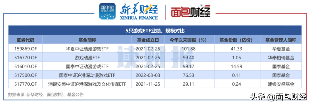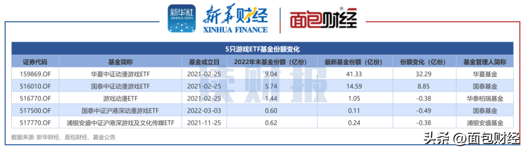 研究显示,全市场主要的5只游戏ETF中,华夏中证动漫游戏ETF、国泰中证动漫游戏ETF规模领先,基金份额超过10亿份。