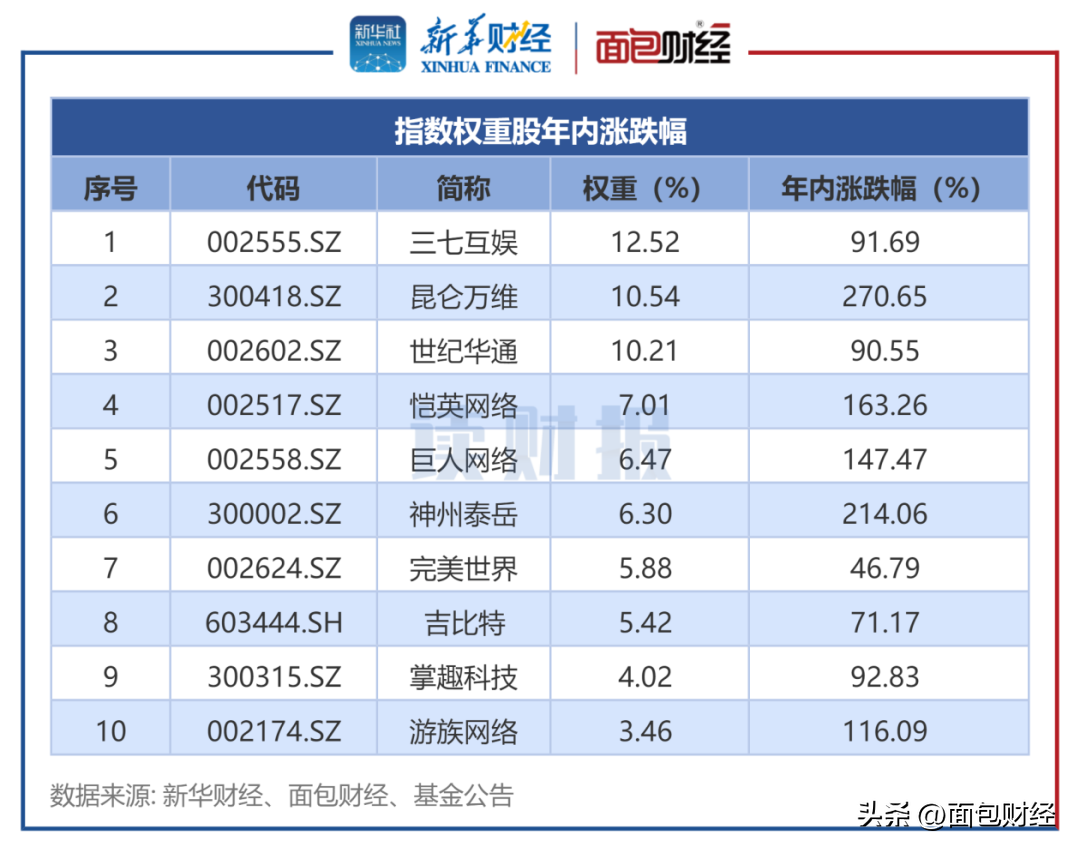 该指数的前十大权重股中,半数股票年内股价上涨超过100%。其中,第二大重仓股昆仑万维年内股价上涨达到270.65%。