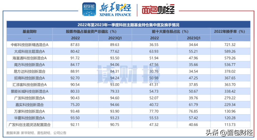 图2:2022年至2023年一季度科创主题基金持仓集中度及换手情况