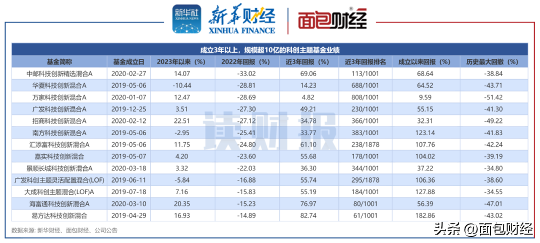 近三年的年报数据显示,广发科技创新混合、景顺长城科技创新混合这2只产品近三年累计亏损均超5亿元,在上述13只科创主题基金中表现较差。