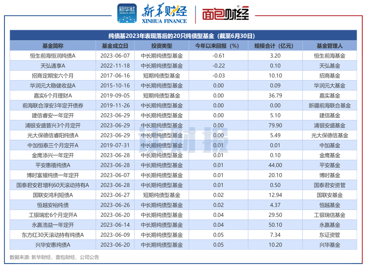 值得关注的是,2023年以来恒生前海恒润纯债A、天弘通享债券发起A基金净值收益率为负,在2000余只纯债基金中领跌。