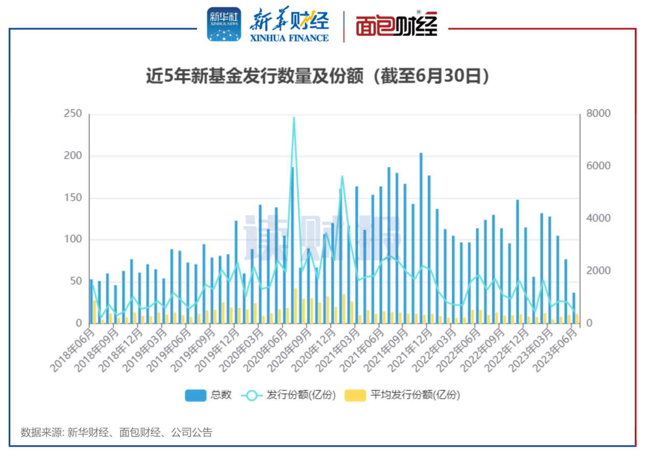 数据显示(截至6月30日,下同),6月首发并已成立的基金仅有37只,合计募集份额约426.23亿份,其中主动权益型基金仅有4只,合计份额为31.84亿份,多只基金发布公告延长募集期或宣布募集失败。而在5月份,新基发行数量、发行份额还创出了2019年以来的新低(以认购起始日为准)。