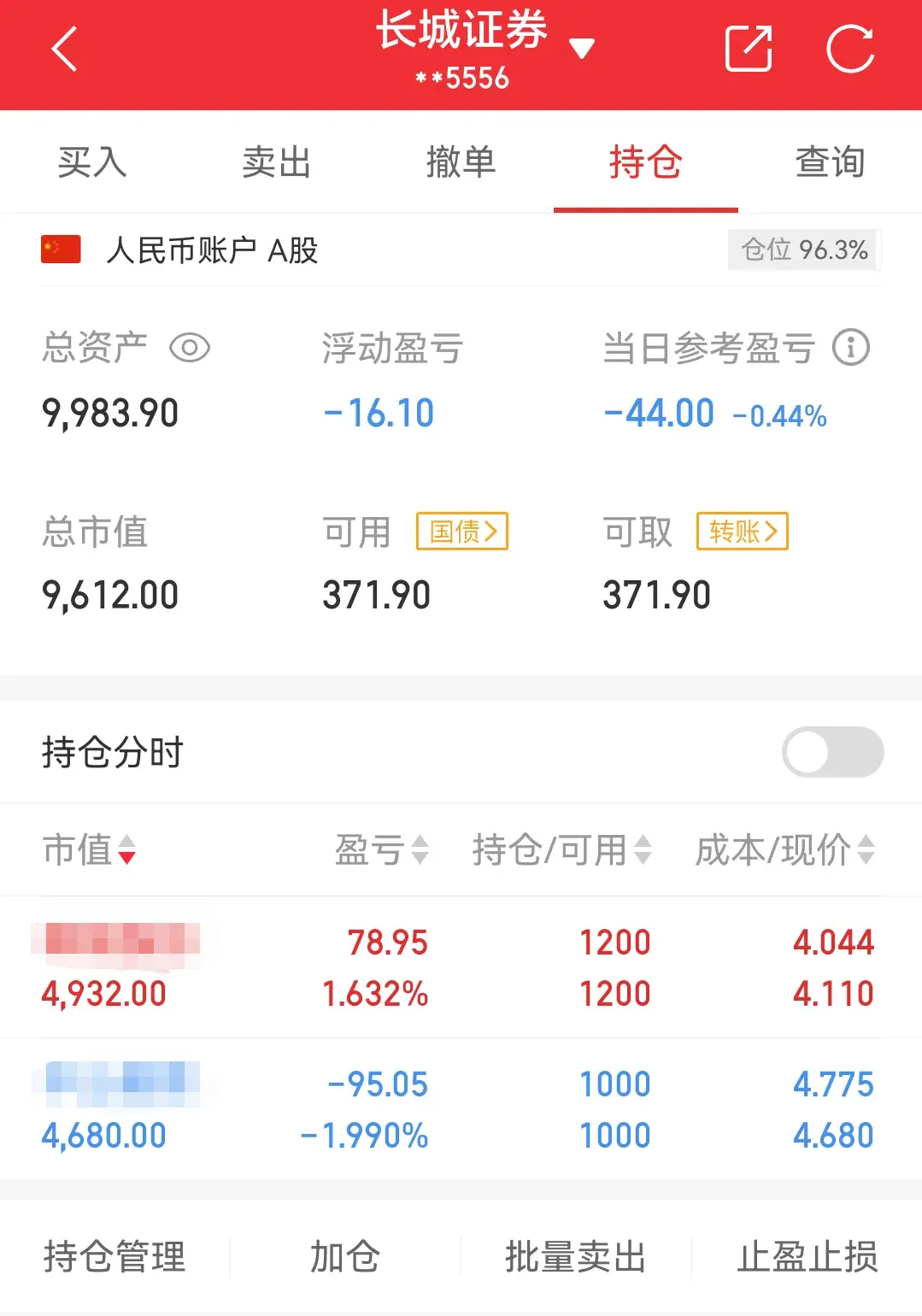 今日仍然是一支盈利,一支亏损,共计浮亏44元;总计浮亏16.1元,暂时跑赢了大盘。