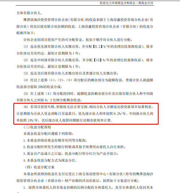 上述基金合同还明确表示,若项目投资失败,即股权无法正常交割,则向合伙人全额返还投资款项并加算利息,计息期限为合伙人资金到账日至退款日,优先级合伙人利率按照8.2%/年,中间级合伙人利率按照15%/年,劣后级合伙人按照同期银行活期存款利率计算。