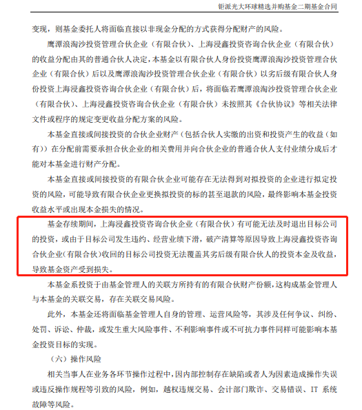 与此同时,基金合同中的风险提示一栏也表明可能出现“上海浸鑫投资咨询合伙企业(有限合伙)收回的目标公司投资无法覆盖其劣后级有限合伙人的投资本金及收益, 导致基金资产受到损失”的现象。