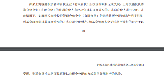 如果项目无法变现,基金合同说明“上海浸鑫的普通合伙人有权决定以非现金分配的方式向合伙人进行分配”,“如基金管理人仍无法将所分得的财产予以钜派光大环球精选并购基金二期基金合同变现,则基金委托人将面临直接以非现金分配的方式获得分配财产的风险。”