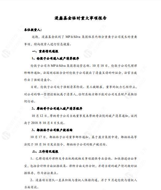 同时,浸鑫基金还在报告中表示,浸鑫项目团队一直在积极与债权人保持沟通,并于去年9月赴伦敦与债权人当面商谈。