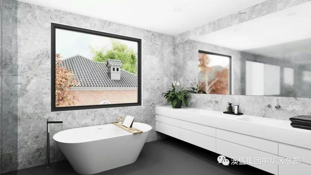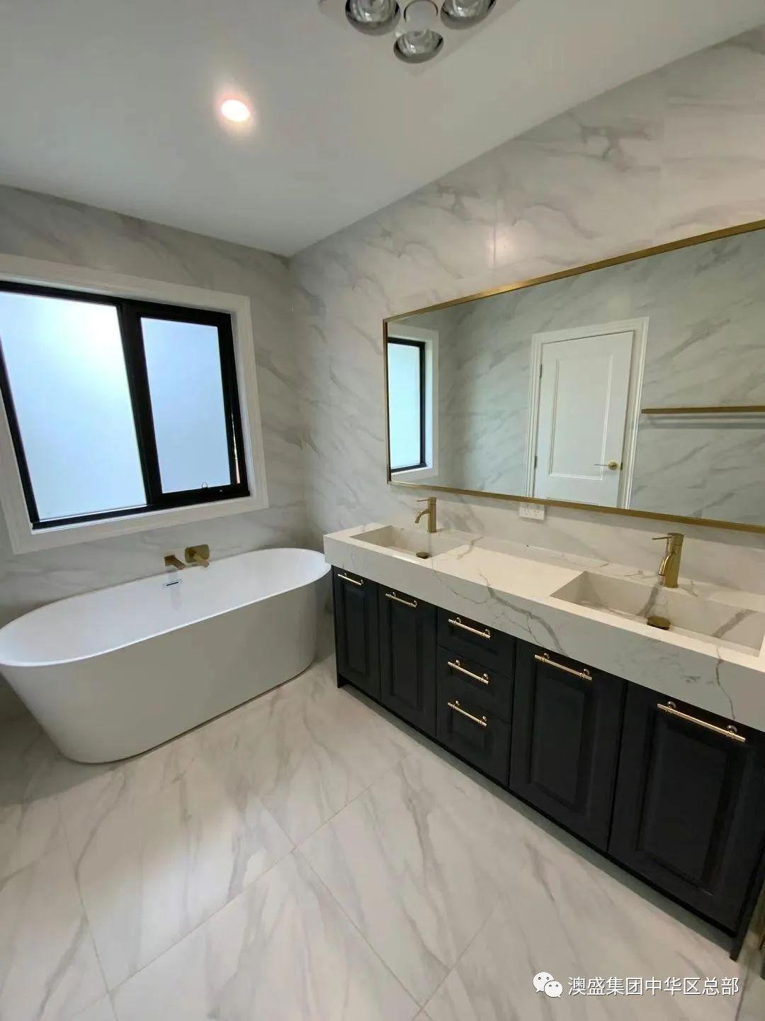 浴室均铺瓷砖到顶,搭配大理石台面、哑光黑水龙头配件、独立式浴缸。