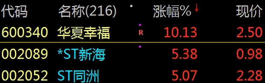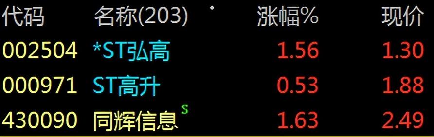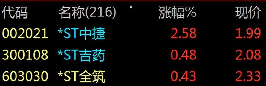 002021*ST中捷涨幅02.56% 603030 *ST全筑涨幅00.43% 002504 *ST弘高涨幅00.00%