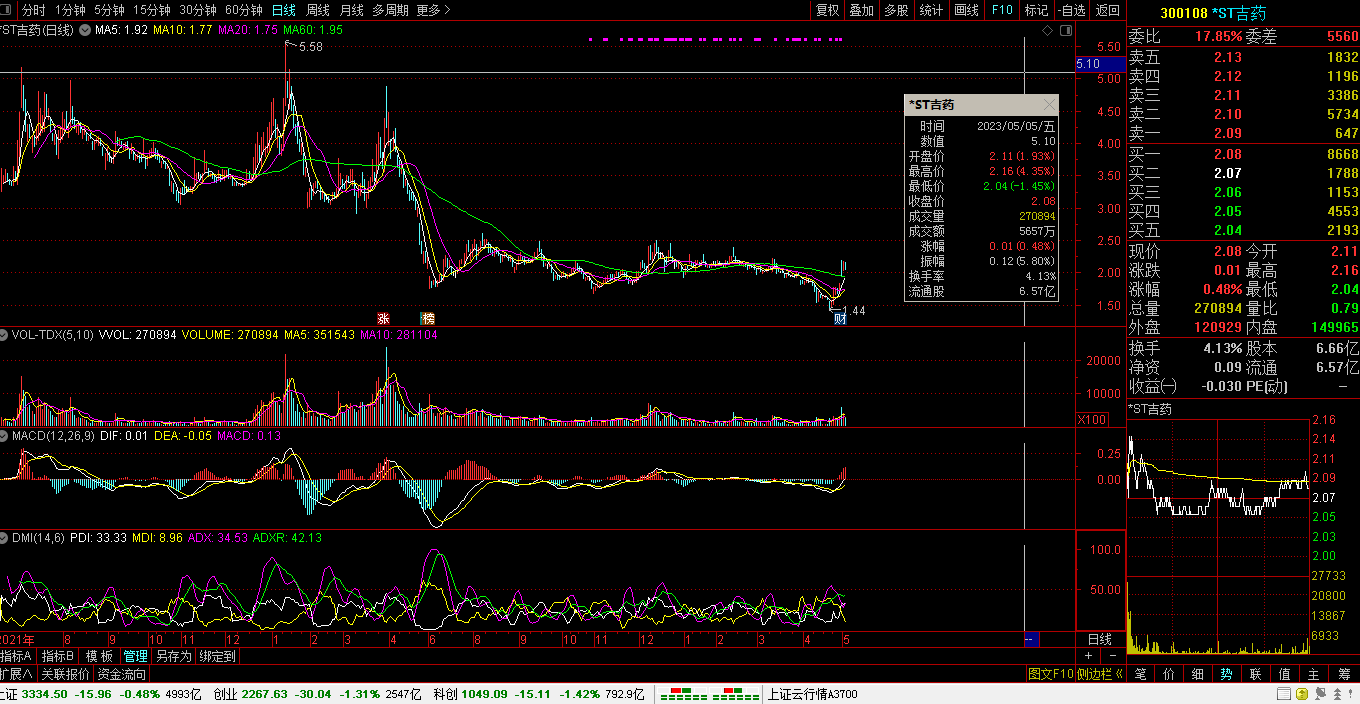 第二、300108*ST吉药涨幅05.05% (0个涨停板;最高涨10.10%)