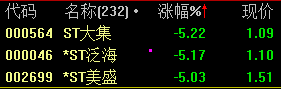 000564 ST大集 000046 *ST泛海 002699 *ST美盛