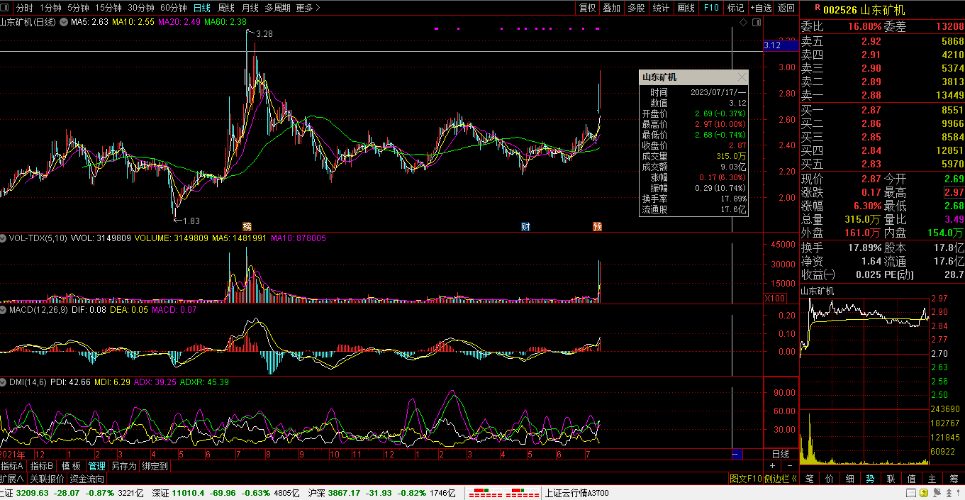07月17日,沪指报3209.63点,跌28.07点,跌0.87%,成交额3221亿。深指报11010.36点,跌69.96点,跌0.63%,成交额4805亿。创指报2207.44点,跌16.66点,跌0.75%,成交额2185亿。科创报984.82点,跌6.74点,跌1.12%,成交额562亿。沪深两市:合计成交8029亿元。北向资金:净买入00.00亿元。