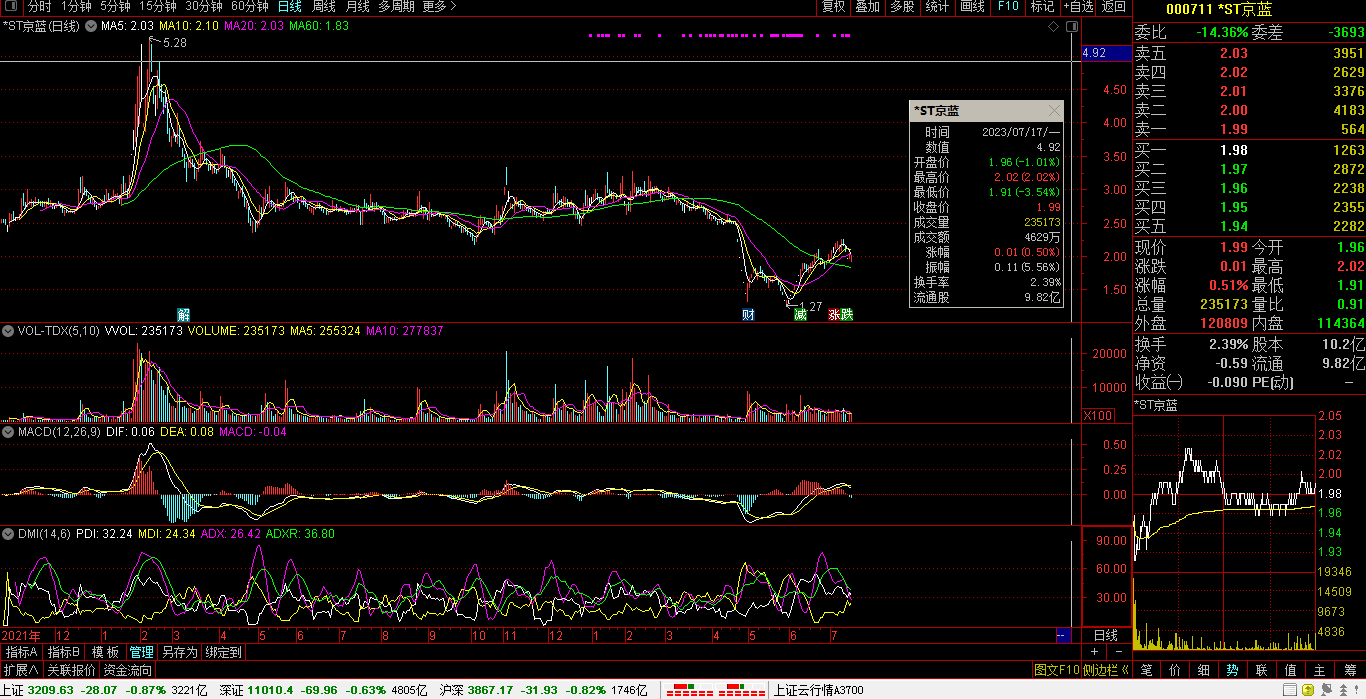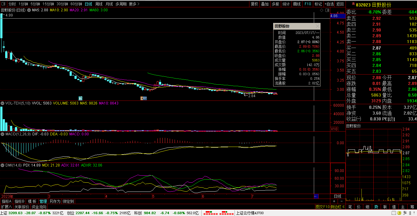 技术看盘-1:看好股票:000711 *ST京蓝;832023 田野股份。