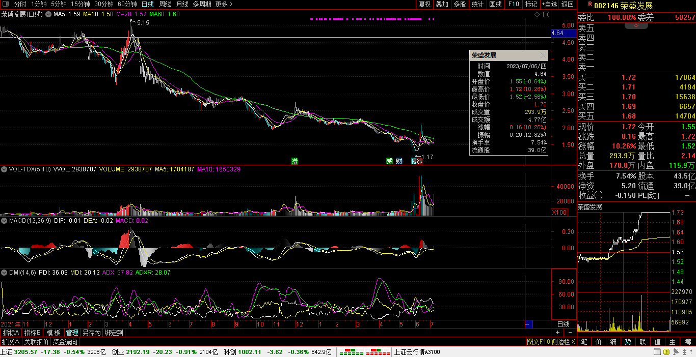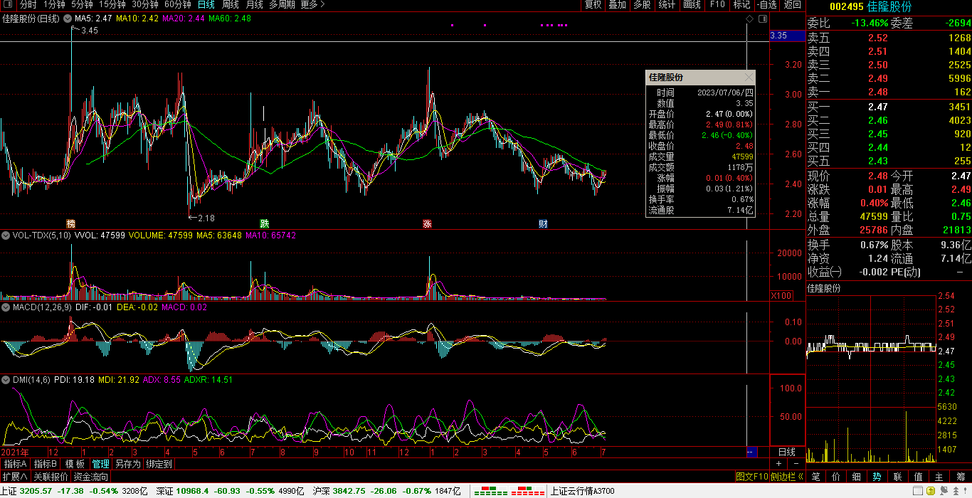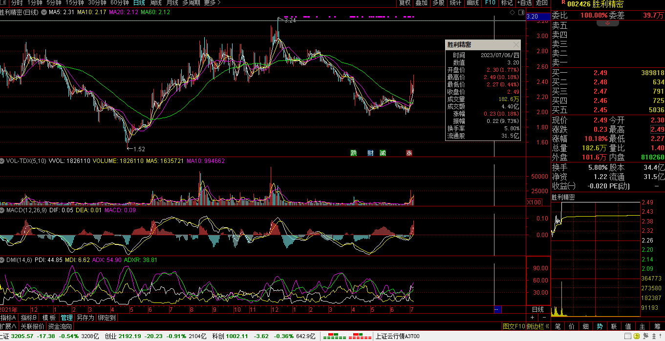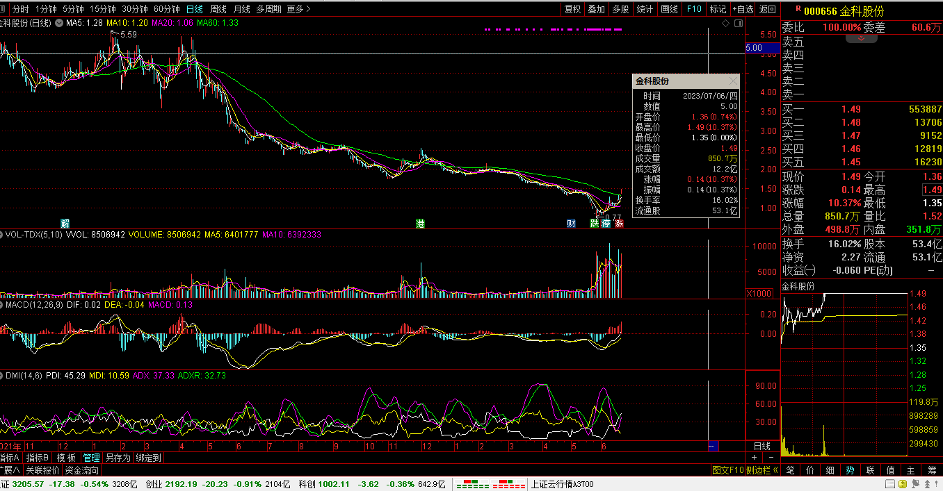 07月06日,沪指报3205.57点,跌17.38点,跌0.54%,成交额3208亿。深指报10968.37点,跌60.93点,跌0.55%,成交额4990亿。创指报2192.19点,跌20.23点,跌0.91%,成交额2104亿。科创50指报1002.11点,跌3.62点,跌0.95%,成交额642亿。沪深两市:合计成交8198亿元,北向资金:净卖出13.44亿元。
