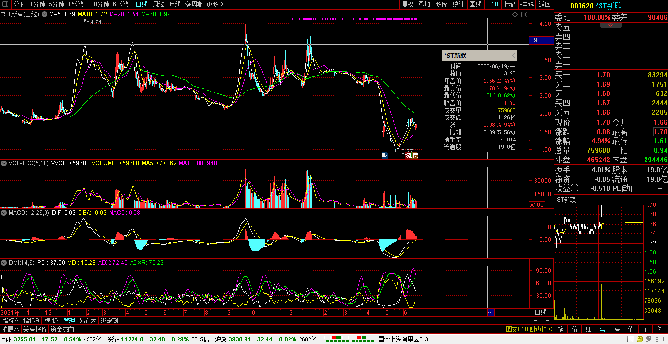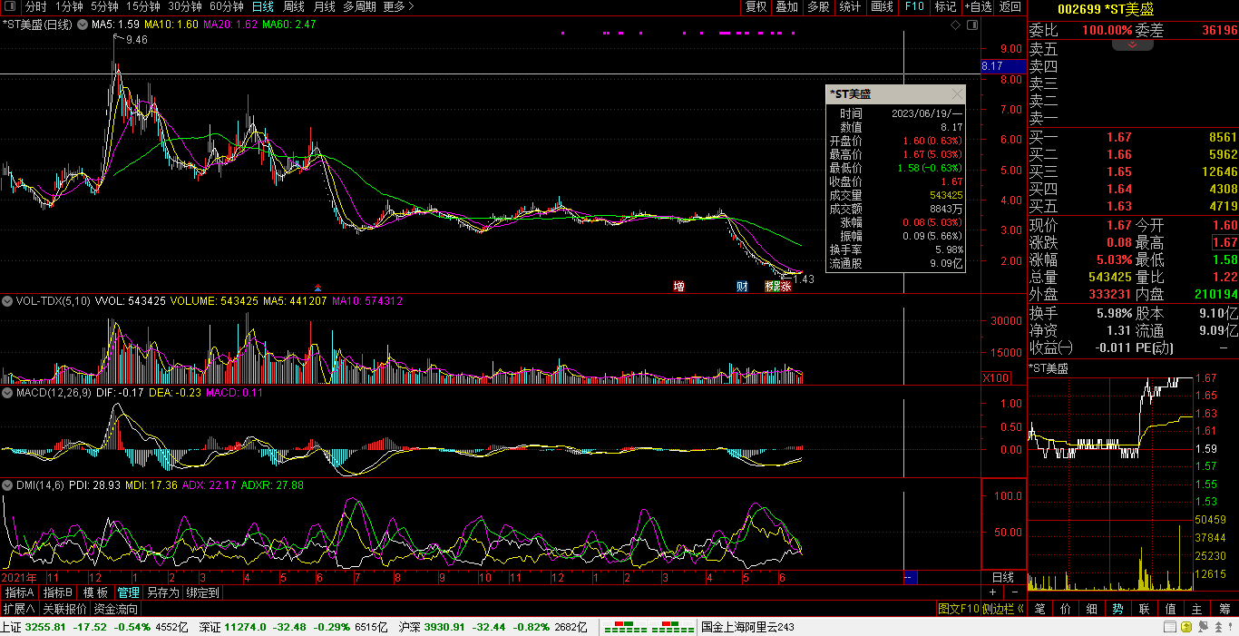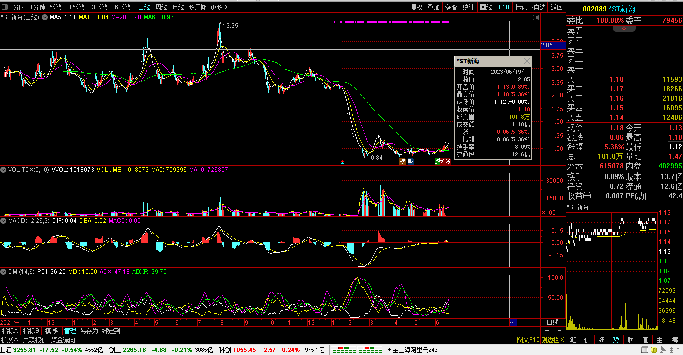 06月19日,沪指报3255.81点,跌17.52点,跌0.54%,成交额4552亿。深指报11274.05点,跌32.48点,跌0.29%,成交额6515亿。创指报2265.18点,跌4.88点,跌0.21%,成交额3085亿。科创报1055.45点,涨2.57点,涨0.24%,成交额975亿。沪深两市:合计成交11067亿元,北向资金:净卖出14.47亿元。