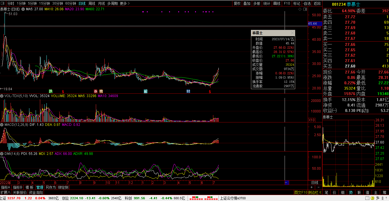 笔者的话:今天主题是:【财富晚茶】公司信息:精汇产业情报;沪深冠军:欣赏泰慕士。今天日历:07月14日。今天盘面:泰慕士:强势趋势,盘中震荡。透视世间:股海涨跌,贫富不均。涨幅居前:泰慕士:连涨7天。跌幅居前:倍轻松:连跌9天。敢问泰慕士?是否带动目前:仍不出名关联板块?笔者:观察F10等“公开资料”,解读含义。今日多空:板块骚动,参考阅读。