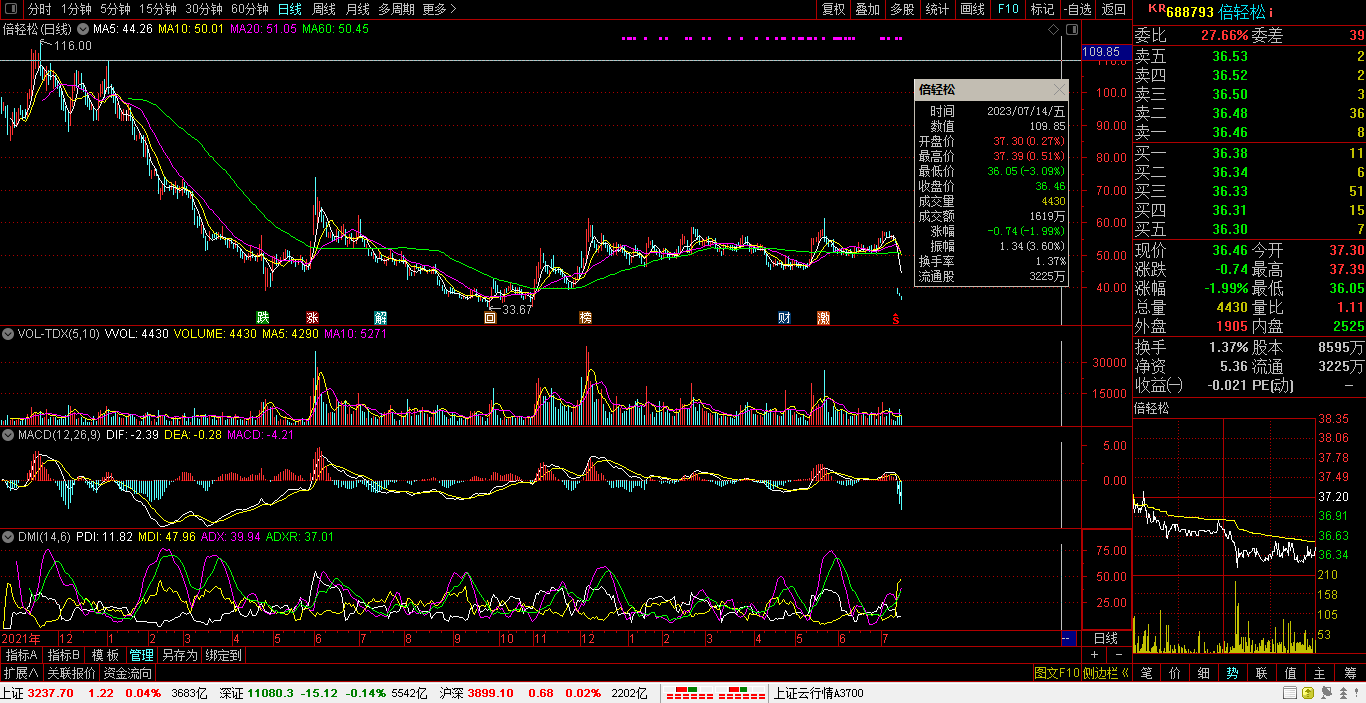 上市日期:2021-07-15。连跌9天:其中0个跌停板(主力强势消化,创新低漫漫股价。今次低换手筹码,跌宕起伏很窒息)。启动日期:最高价57.18元到最低价36.05元。让投资人:倾家荡产。趋势:下周:阻力位:37.39元。支撑位:36.05元。