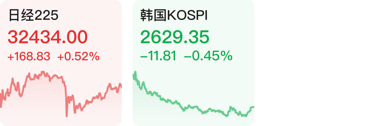 日经225指数涨0.52%,韩国KOSPI指数跌0.45%。
