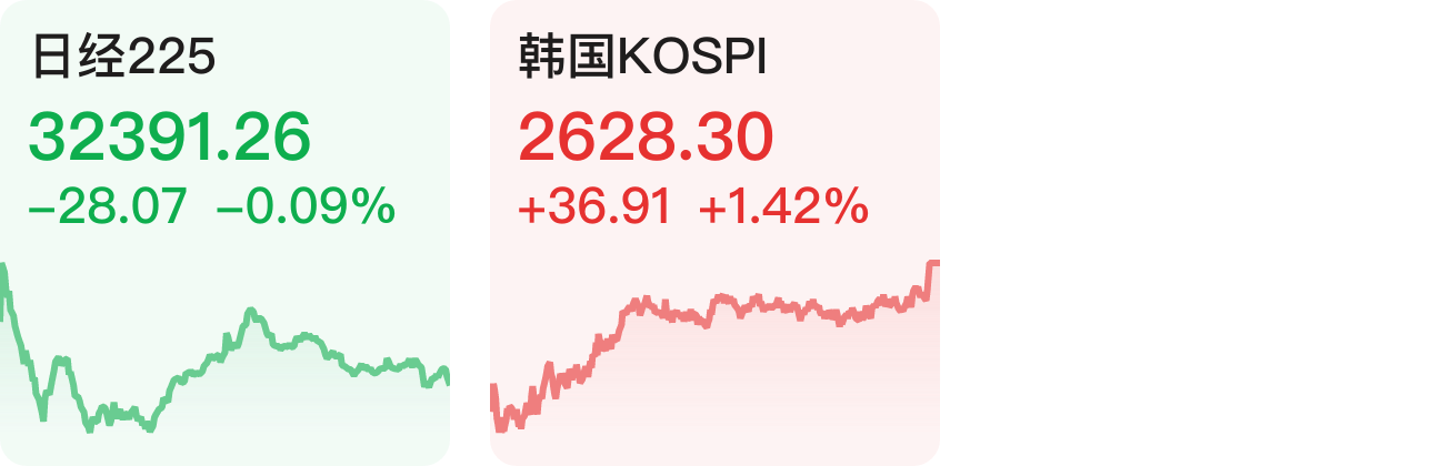 日经225指数跌0.09%,韩国KOSPI指数涨1.42%。