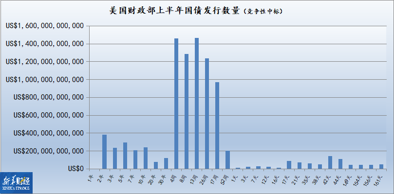新华财经北京7月13日电(李奇涵)截至6月30日,美国财政部上半年发行各期限国债逾9万亿美元(不含非竞争性招标,下同),同比大幅增长23%。从债券类型来看,4周-52周短期国债(T-Bill)发行量最大,其次...