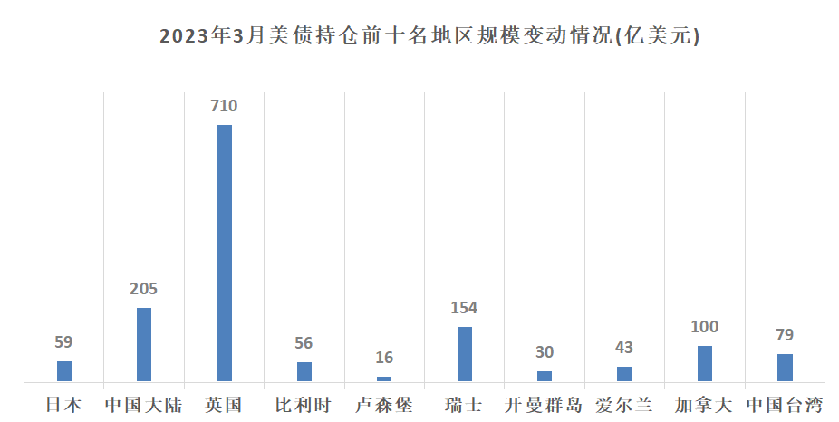 与2月对比来看,3月各国/地区持仓变动幅度明显加大,瑞士、加拿大和中国台湾对美债的增持量分别为154亿美元、100亿美元和79亿美元,而三个各国/地区曾在2月均选择减持,其中加拿大在2月减仓幅度达到188亿美元。