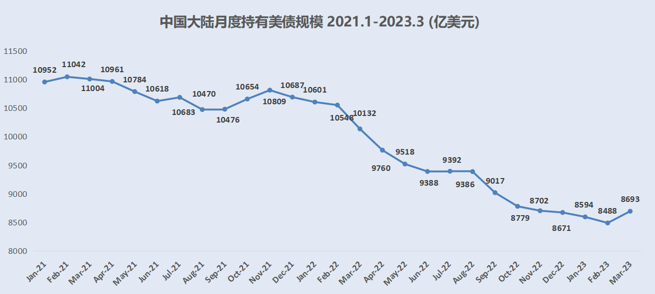 再来看美债前两大“债主”的表现,中国大陆2023年3月净买入205亿美元美债,打破了此前连续7个月减仓的态势,美债仓位现为8693亿美元,回升至2022年11月水平左右,不过该数据仍然保持在2010年6月以来的近13年低位,并连续12个月持仓低于1万亿美元。