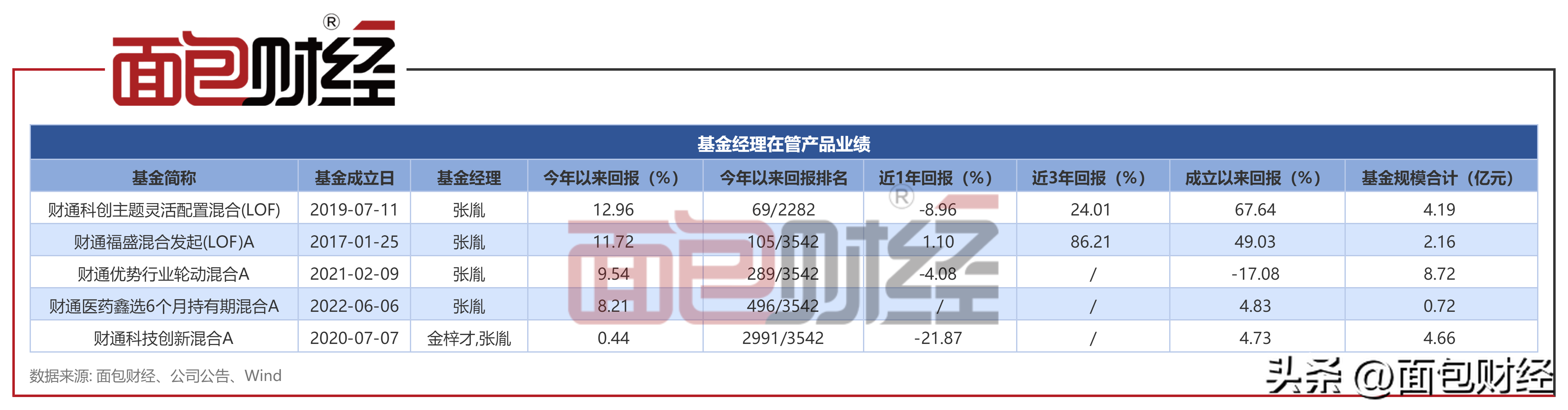 目前,张胤主要管理财通优势行业轮动混合、财通科技创新混合、财通科创主题灵活配置混合等5只产品(包括共同管理产品),上述产品合计规模约20.46亿元。